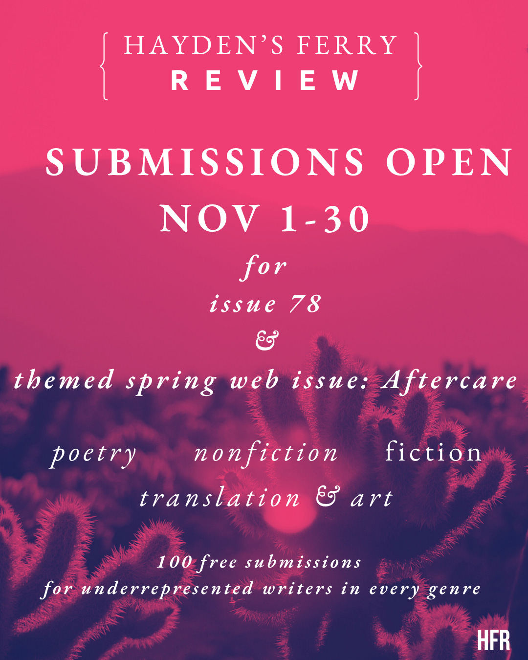 I’m thrilled to share that Hayden’s Ferry Review will be opening general submissions for our print Issue 78 and themed submissions for our web issue “Aftercare” on November 1st!